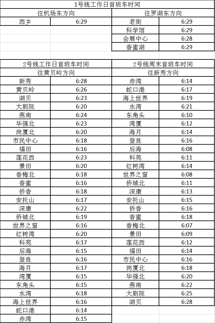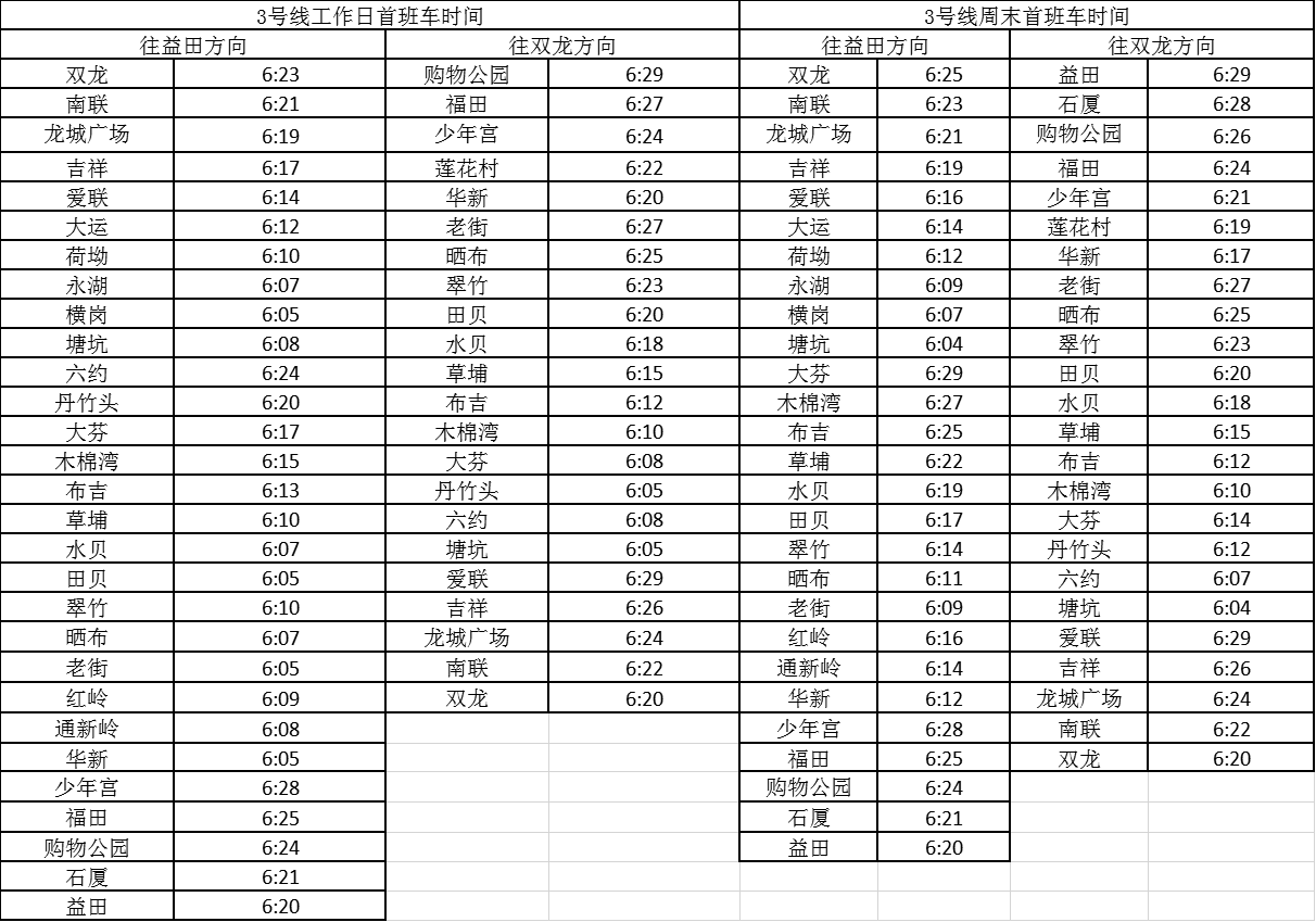 記者獲悉,經(jīng)優(yōu)化調(diào)整后,各線路工作日首班車(chē)最早發(fā)車(chē)站點(diǎn)及時(shí)間分別為,1號(hào)線老街站6:29、2號(hào)線蛇口港站6:14、3號(hào)線塘坑站6:05、5號(hào)線坂田站6:01、7號(hào)線赤尾6:09、9號(hào)線銀湖6:05、11號(hào)線機(jī)場(chǎng)站6:04。周末期間首班車(chē)最早發(fā)車(chē)站點(diǎn)及時(shí)間分別為,2號(hào)線香梅北站6:07、3號(hào)線塘坑站6:04、5號(hào)線長(zhǎng)嶺陂站6:00、7號(hào)線皇崗口岸站6:09、9號(hào)線孖嶺站6:05、11號(hào)線機(jī)場(chǎng)站6:03。