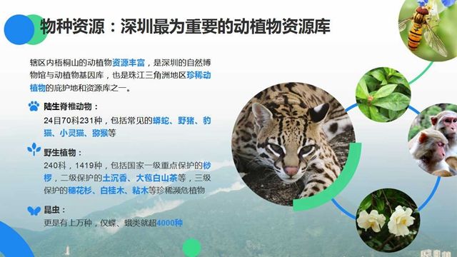 轄區(qū)內(nèi)梧桐山的動植物資源豐富,是深圳的自然博物館與動植物基因庫,也是珠江三角洲地區(qū)珍稀動植物的庇護(hù)地和資源庫之一。經(jīng)調(diào)查統(tǒng)計(jì),有24目70科231種,包括常見的蟒蛇、野豬、豹貓、小靈貓、獼猴等;野生植物240科,1419種,包括國家一級重點(diǎn)保護(hù)的桫欏,二級保護(hù)的土沉香、大苞白山茶等,三級保護(hù)的穗花杉、白桂木、粘木等珍稀瀕危植物;昆蟲更是有上萬種,僅蝶、蛾類就超4000種。