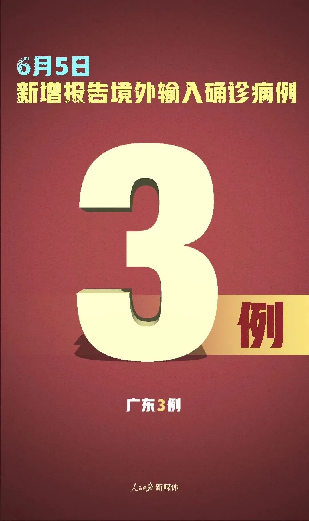 6月5日0-24時,31個?。ㄗ灾螀^(qū)、直轄市)和新疆生產(chǎn)建設兵團報告新增確診病例3例,均為境外輸入病例(廣東3例);無新增死亡病例;新增疑似病例1例,為境外輸入病例(上海1例)。