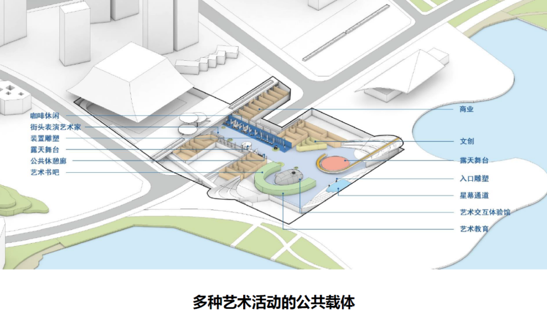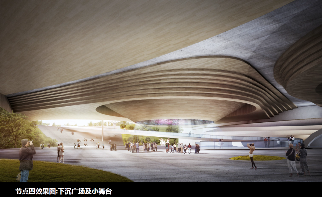 南側(cè)主體建筑之下的藝術(shù)開(kāi)放大廳,連續(xù)的吊頂在這里變化、發(fā)散又聚合,自然圍合出具有先鋒藝術(shù)水準(zhǔn)的表演舞臺(tái)和藝術(shù)體驗(yàn)館區(qū)域。