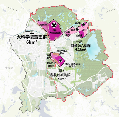 “一副”即科教融合集群。規(guī)劃面積4.1平方公里,是科學(xué)城的科教融合區(qū),布局大科學(xué)裝置和高水平大學(xué),作為大科學(xué)裝置近期集中啟動區(qū),為近期科學(xué)城建設(shè)提供空間保障。