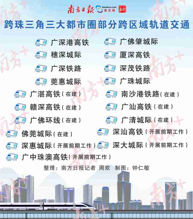 廣州、深圳“CP感”滿滿,通過廣深港高鐵、穗深城際、廣深鐵路等快速互聯(lián),最快半小時互通。而廣州地鐵28號線將連接佛山、廣州、東莞,支線還擬延伸至惠州。廣州地鐵18號線則規(guī)劃深入中山、珠海。肇慶、中山、江門、佛山等也紛紛“到深圳去”……