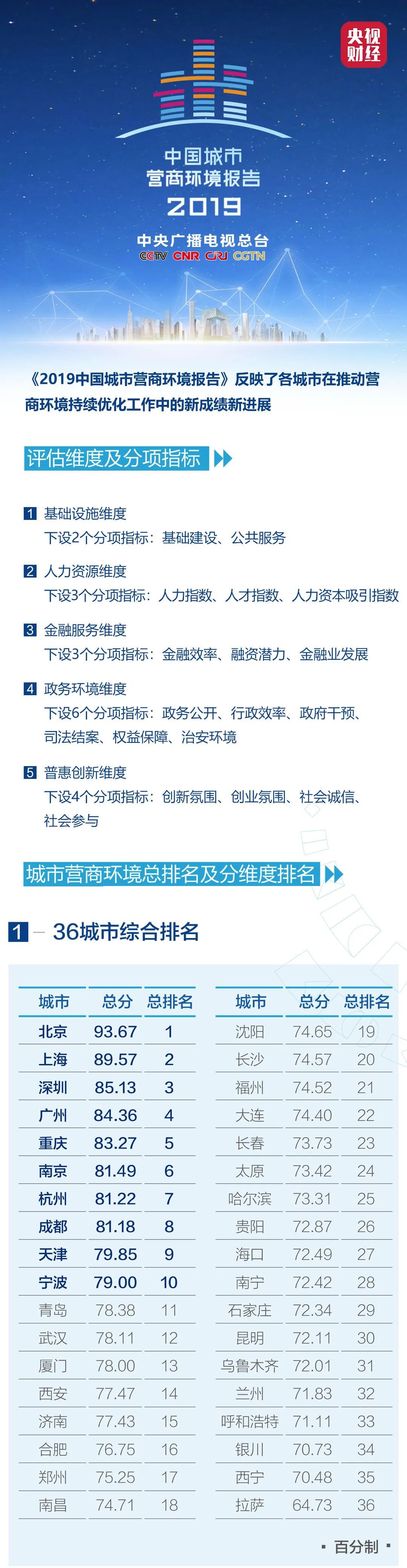 《2019中國城市營商環(huán)境報告》在對標世界銀行營商環(huán)境評價體系標準、參照國際同行的評價指標,同時兼顧中國特色的原則上,重點圍繞與市場主體密切相關的指標維度構建起中國城市營商環(huán)境的評價體系。報告中的綜合評價排名對象為4個直轄市、27個省會城市和自治區(qū)首府,以及5個計劃單列市。報告在原有的評價范圍之上,首次增加了對經(jīng)濟總量位居前100名活躍城市的評價。