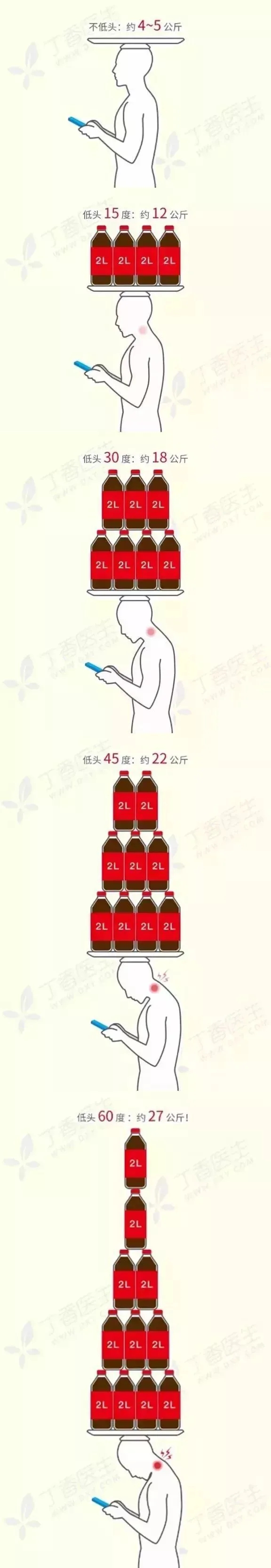 你知道人的頭多重嗎?5公斤左右。所以,當(dāng)你抬頭挺胸時(shí),脖頸只需要承受約5公斤的重量。但是,在你前傾低頭60度看手機(jī)時(shí),頸部就需承受25~30公斤的重量!