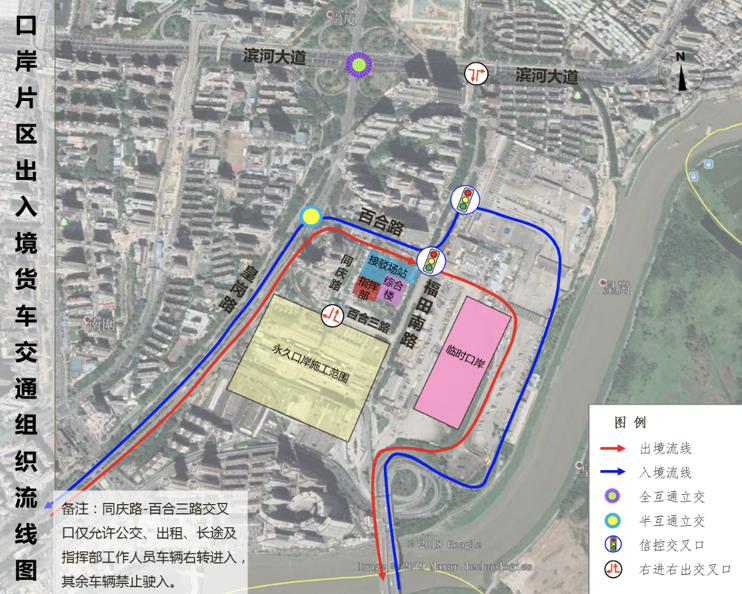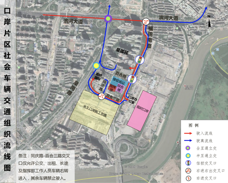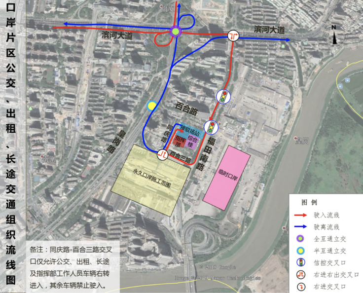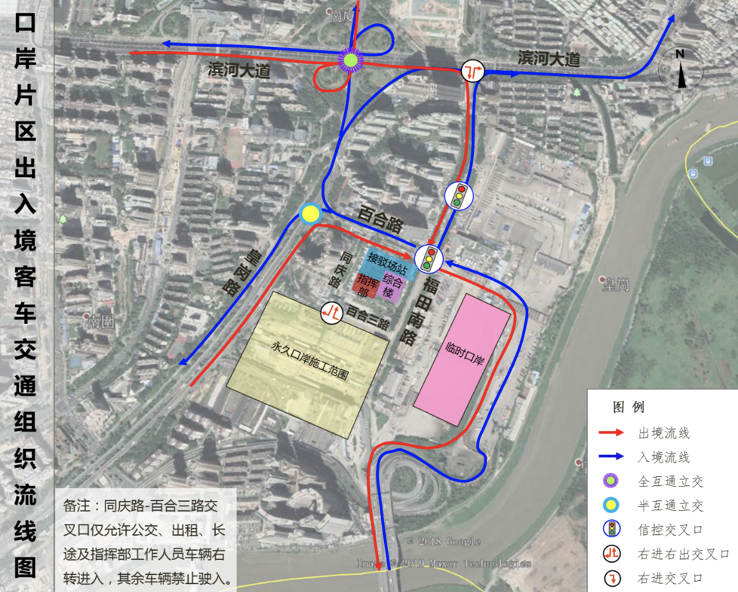 臨時口岸期間機動車交通按照“流線順暢、客貨分離、人車分離”的原則進(jìn)行組織。主要利用口岸片區(qū)的皇崗路、百合路、福田南路、同慶路等進(jìn)行組織。各交通方式交通組織流線圖如下: