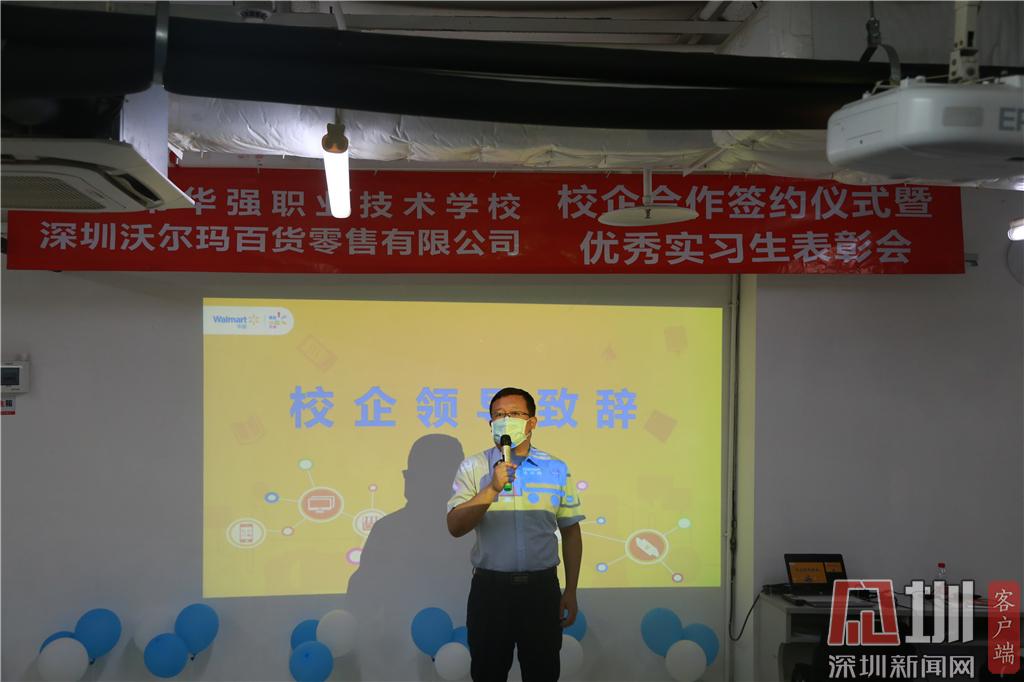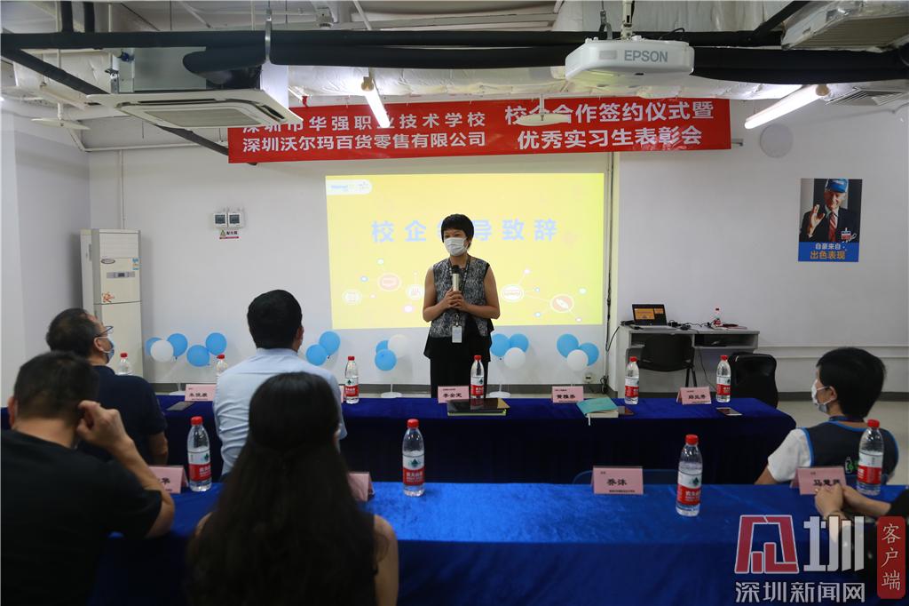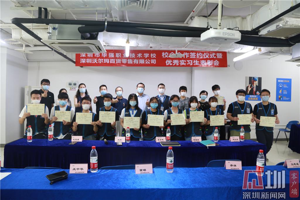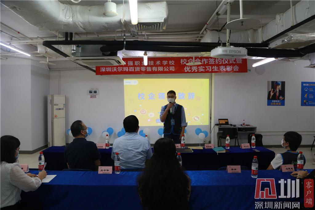 見(jiàn)圳客戶端·深圳新聞網(wǎng)2020年6月24日訊(記者 曹園芳 通訊員 沈琳 喬沐)昨天下午,深圳市華強(qiáng)職業(yè)技術(shù)學(xué)校與深圳沃爾瑪百貨零售公司簽訂校企合作協(xié)議。趙盟校長(zhǎng)、朱俊康副校長(zhǎng)、西校區(qū)王中華主任、校企合作辦黃琳主任、商貿(mào)部喬沐部長(zhǎng)、財(cái)經(jīng)部馬慧連副部長(zhǎng)、辦公室沈琳老師及學(xué)校優(yōu)秀實(shí)習(xí)生代表出席了簽約儀式暨優(yōu)秀實(shí)習(xí)生表彰會(huì)。