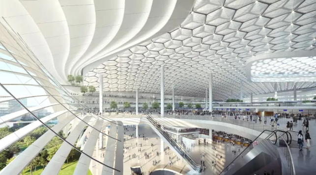 主創(chuàng)團(tuán)隊介紹,新皇崗口岸的設(shè)計以“國之重器”為概念?!皣仄鳌闭w形態(tài)對稱、穩(wěn)固,輔以新型石材主導(dǎo)的幕墻系統(tǒng),采用外立面虛實相間的材料運用,充滿未來感;抬高的景觀基座抬升主體,氣勢莊重;建筑整體以充滿力量感的純凈體量,寄喻口岸為大灣區(qū)發(fā)展的基石重器。
