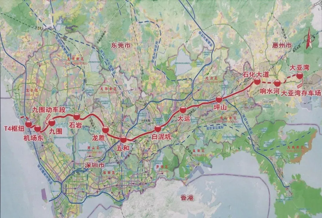 深大城際:起自深圳寶安國際機(jī)場T4樞紐,經(jīng)寶安、龍華、龍崗、坪山至惠州大亞灣,全長86公里,計劃總投資438.8億元。