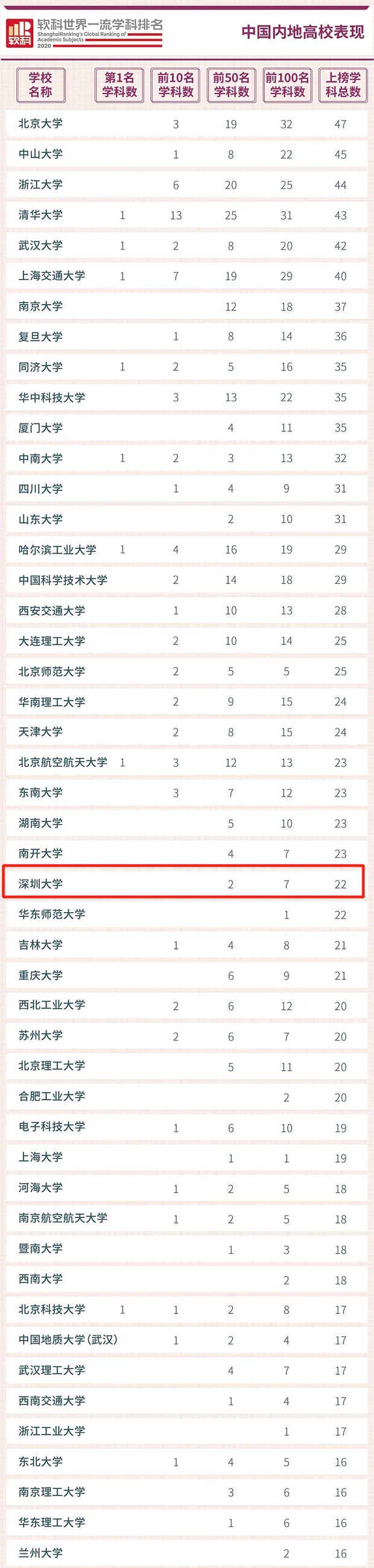 見(jiàn)圳客戶(hù)端·深圳新聞網(wǎng)2020年6月29日訊(見(jiàn)圳客戶(hù)端、深圳新聞網(wǎng)記者 梁榆其 金洪竹)6月29日,軟科正式發(fā)布2020“軟科世界一流學(xué)科排名”,排名覆蓋54個(gè)學(xué)科,涉及理學(xué)、工學(xué)、生命科學(xué)、醫(yī)學(xué)和社會(huì)科學(xué)五大領(lǐng)域,中國(guó)內(nèi)地共有253所高校上榜。深圳大學(xué)(以下簡(jiǎn)稱(chēng)“深大”)共有22個(gè)學(xué)科上榜,上榜學(xué)科數(shù)領(lǐng)跑地方高校,總上榜學(xué)科數(shù)位列中國(guó)內(nèi)地高校26位,其中,7個(gè)學(xué)科位列世界百?gòu)?qiáng),2個(gè)學(xué)科進(jìn)入世界50強(qiáng)。
