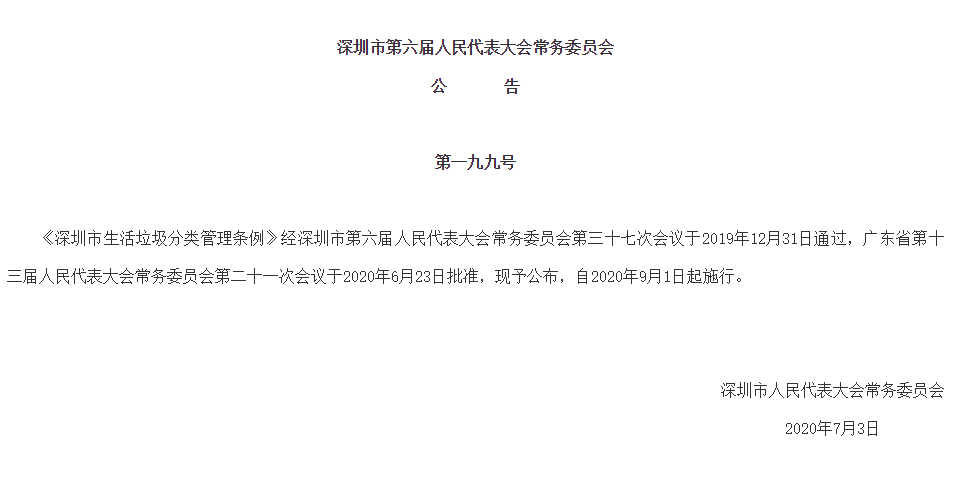 見(jiàn)圳客戶端·深圳新聞網(wǎng)2020年7月4日訊(見(jiàn)圳客戶端、深圳新聞網(wǎng)記者 葉梅)記者從深圳市人大常委會(huì)官方網(wǎng)站獲悉,《深圳市生活垃圾分類管理?xiàng)l例》(以下簡(jiǎn)稱《條例》)經(jīng)深圳市第六屆人民代表大會(huì)常務(wù)委員會(huì)第三十七次會(huì)議于2019年12月31日通過(guò),廣東省第十三屆人民代表大會(huì)常務(wù)委員會(huì)第二十一次會(huì)議于2020年6月23日批準(zhǔn),將于2020年9月1日起施行,從垃圾分類投放、收集運(yùn)輸處理、源頭減量和循環(huán)利用等方面提出了明確要求。