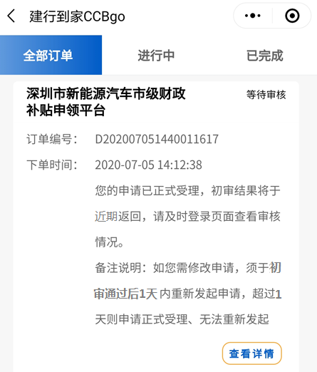 客戶完成補貼申請?zhí)峤缓螅脚_將進行首次初審,初審結果將于近期返回并通過短信方式告知客戶。屆時,客戶可通過登錄“建行到家CCBgo-我的-我的申請”查看審核進展。