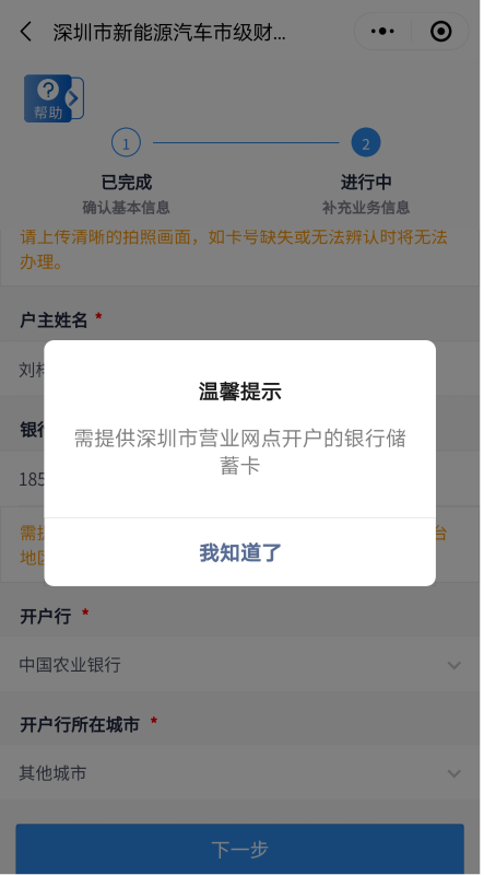 客戶需上傳銀行卡照片,并填寫銀行賬號、開戶行信息。開戶行如不在選項范圍內可選擇“其他”自填。其中,銀行賬號需為深圳市營業(yè)網點開戶的銀行一類儲蓄卡,華僑、港澳臺地區(qū)居民及外國人需提供深圳市建設銀行一類儲蓄卡。