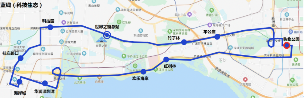 ??空军c:世界之窗總站→竹子林→車公廟→購物公園→紅樹林→歡樂海岸→華潤深圳灣→海岸城→深大-騰訊站→科技園→世界之窗總站