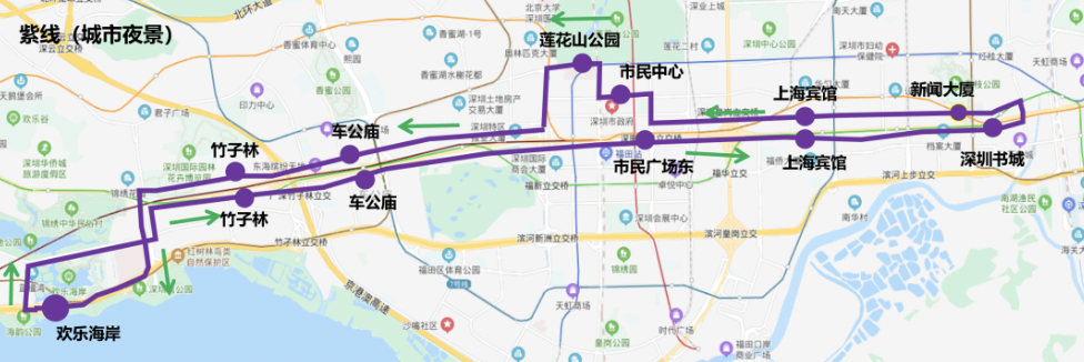 ??空军c:歡樂海岸→竹子林→車公廟→市民廣場東→上海賓館→深圳書城→新聞大廈→上海賓館→市民中心→蓮花山公園→車公廟→歡樂海岸