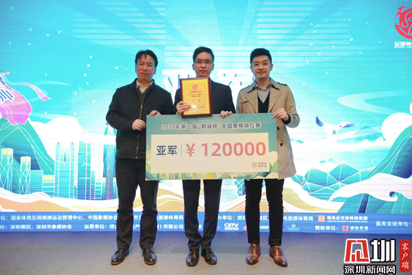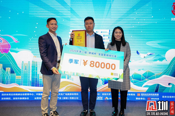 王志強與麥帆為王天一頒發(fā)今年“鵬城杯”獎杯以及30萬元的冠軍獎金。王天一表示,“鵬城杯”是國內(nèi)平均水平最高的賽事,經(jīng)過兩年成功辦賽,現(xiàn)在影響力越來越大,受到廣大棋手們和社會各方的重視,感謝深圳市文化廣電旅游體育局與佳兆業(yè)的鼎力支持。而“鵬城杯”也讓他在2020年末實現(xiàn)了一個小目標(biāo),今年唯一的一個個人賽冠軍,也實現(xiàn)了每年都能獲得一個冠軍的愿望。