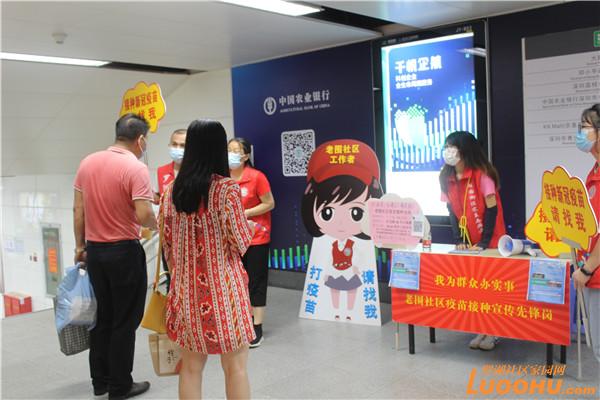 客運(yùn)繁忙的大劇院地鐵站就在老圍社區(qū),老圍社區(qū)黨委就把“疫苗接種宣傳先鋒崗”從小區(qū)卡口擴(kuò)展到地鐵口。在川流不息的地鐵口,宣傳崗上的大字“我為群眾辦實(shí)事,老圍社區(qū)疫苗接種宣傳先鋒崗”,金光閃閃格外醒目。旁邊的小喇叭循環(huán)播放:“接種疫苗人人有責(zé),打第二針疫苗請找我,不用排隊(duì)不用預(yù)約,專車接送。”