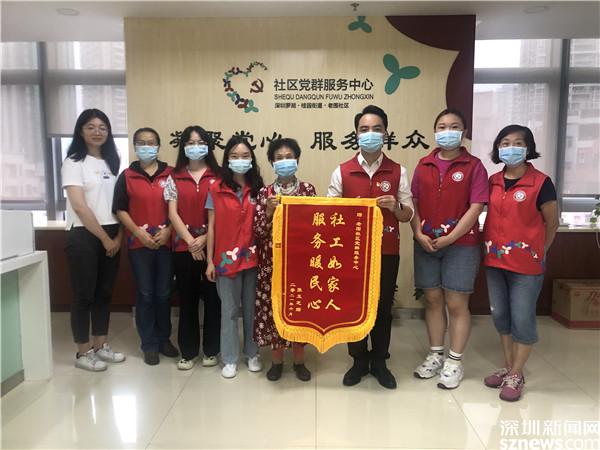 讀特客戶端·深圳新聞網(wǎng)2021年6月28日訊(記者 劉嘉敏 通訊員 楊紀(jì)歐)6月28日上午,79歲的社區(qū)居民張玉芝冒雨來到羅湖區(qū)桂園街道老圍社區(qū)黨群服務(wù)中心,將一面金光閃閃的錦旗,交到老圍社區(qū)黨委副書記黃小龍的手中。錦旗上兩行金光閃閃的大字格外醒目:“社工如家人,服務(wù)暖民心?!?/p>