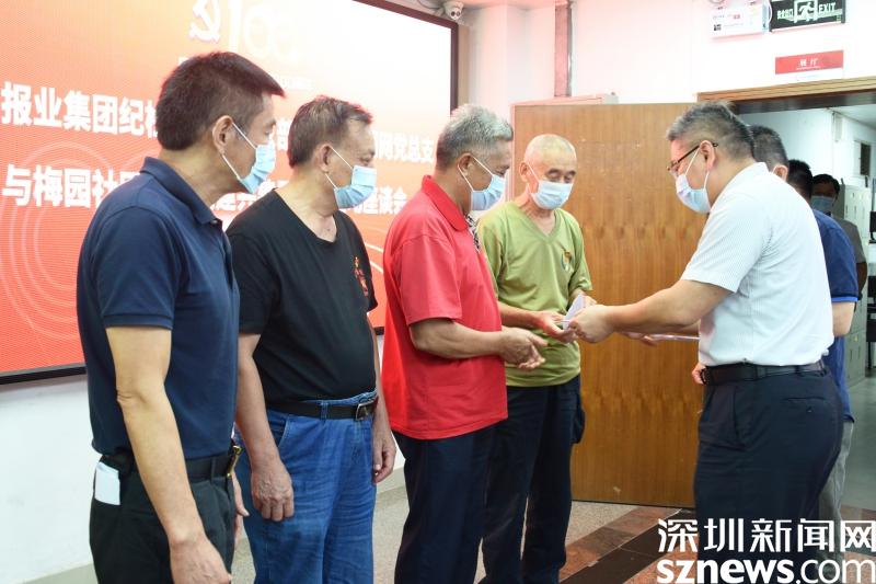 黨課結束后,陳鵬等代表深圳報業(yè)集團一行對社區(qū)老黨員進行慰問,并向老黨員代表送上慰問金和禮包,隨后,陳鵬向梅園社區(qū)“光榮在黨50年”老黨員們頒發(fā)紀念章,“你們辛苦了,我們要向你們學習,希望你們注意身體,繼續(xù)為社區(qū)做貢獻?!标慁i捧起紀念章,為老黨員們戴上,并對老黨員們送上關心和祝福。