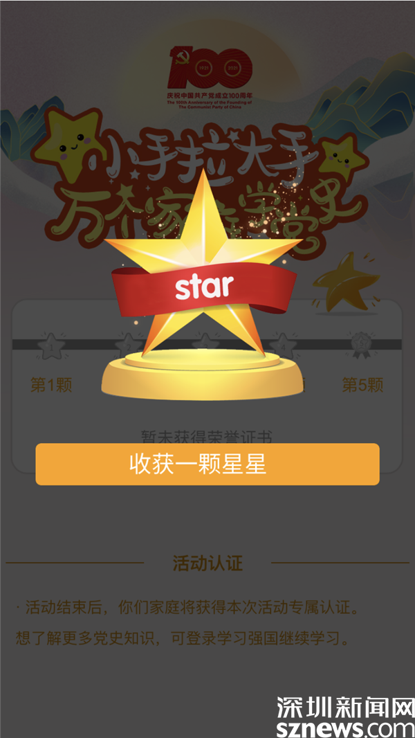 本次活動面向羅湖轄區(qū)中小學(xué)學(xué)生及家庭。6月28日至7月8日,學(xué)生及家長可以下載“羅湖Plus”APP,點擊首頁“服務(wù)”進入“小手拉大手黨史學(xué)習(xí)”活動專欄并完成注冊。活動期間,每完成1次打卡即答對全部題目,可獲得1次親子“點亮星星”的機會。每輪答題如有1道答錯即為“闖關(guān)失敗”,可以點擊“再來一次”繼續(xù)答題,直到全部答對為止。10天內(nèi)完成5次打卡任務(wù),即可點亮5顆小星星獲得“升旗手”個人榮譽證書。