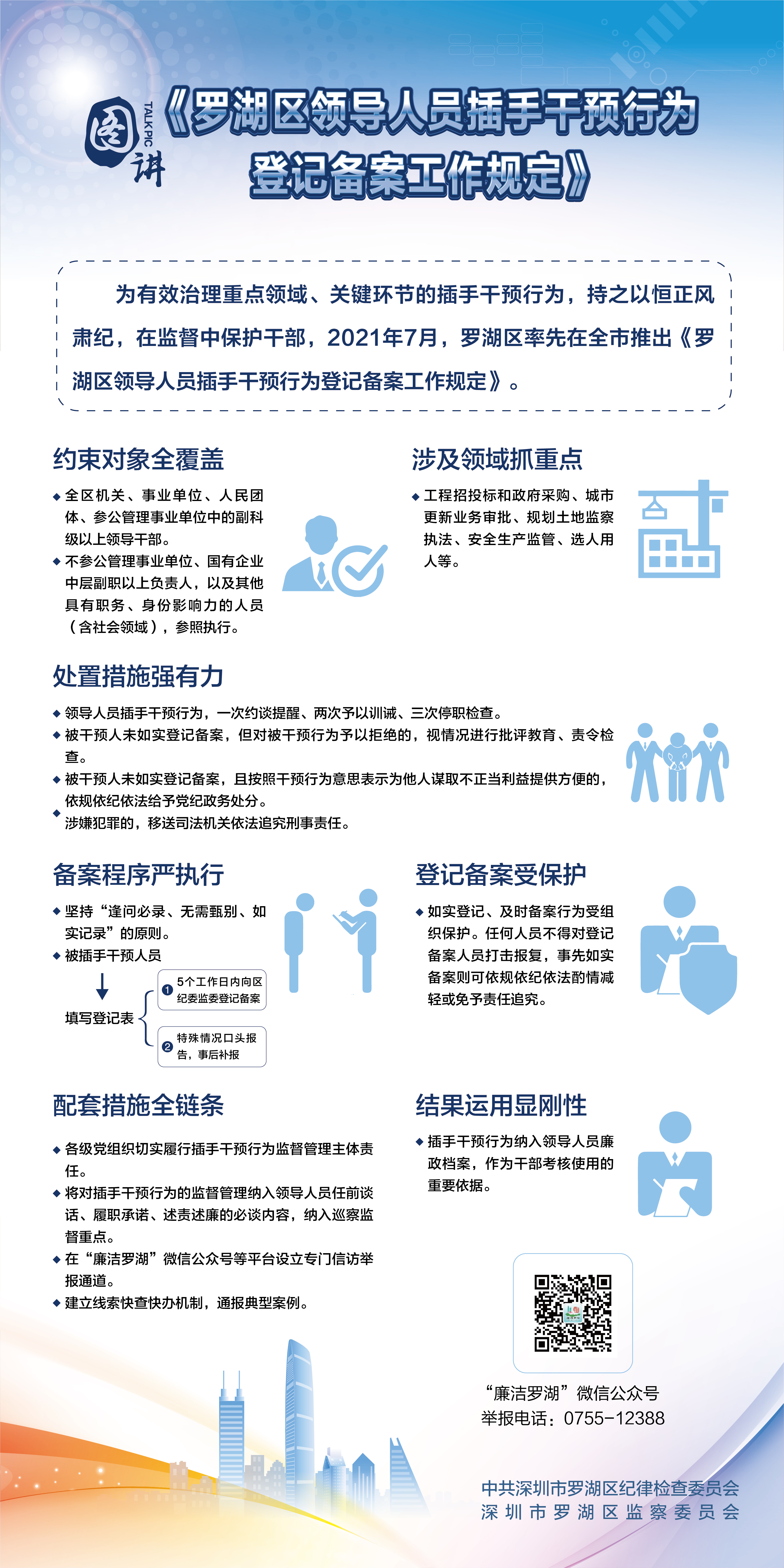 為充分釋放制度活力,羅湖區(qū)紀(jì)委監(jiān)委完善了全鏈條配套措施。插手干預(yù)行為的監(jiān)督管理納入領(lǐng)導(dǎo)人員任前談話、履職承諾、述責(zé)述廉的必談內(nèi)容和巡察監(jiān)督重點,插手干預(yù)行為納入領(lǐng)導(dǎo)人員廉政檔案,作為干部考核使用的重要依據(jù)。同時在“廉潔羅湖”微信公眾號等平臺設(shè)立信訪專欄,建立線索快查快辦機制,通報典型案例,讓插手干預(yù)行為暴露在陽光下。