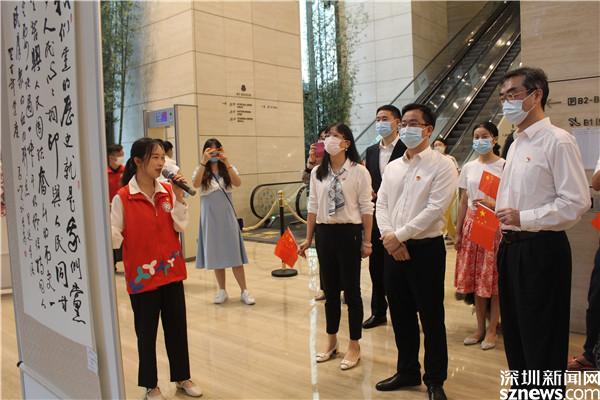 展覽活動以深圳市人大代表楊樂高歌一曲《春天的故事》拉開了序幕,兩位黨史講解員也是老圍社區(qū)年輕的黨員代表,她們以中國共產(chǎn)黨百年歷史紅色基因傳遞者的身份,以聲情并茂的講解,將與會人員帶到一排排精美的字畫前。從紅船開始到百年華誕,從東江縱隊精神至今日全民抗疫,還有40年深圳改革開放的日新月異,無不記錄了百年黨史每一個階段的精彩瞬間,每一幅作品都令人難忘。