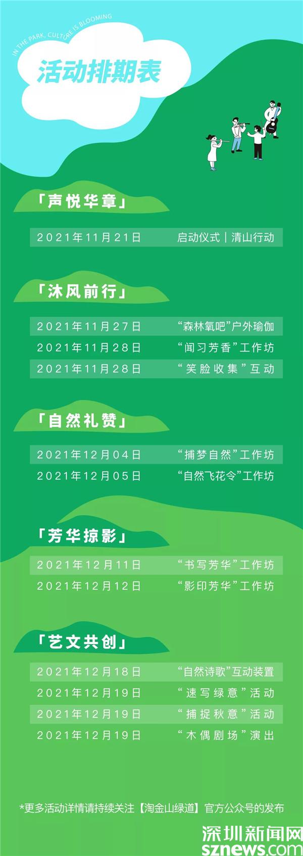 據(jù)悉,自11月27日起連續(xù)四個(gè)周末,深圳公園文化季羅湖分會(huì)場(chǎng)將帶來(lái)一系列健康療愈、藝術(shù)文化、傳統(tǒng)文化等戶外活動(dòng),市民可以通過(guò)關(guān)注“淘金山綠道”公眾號(hào)了解更多活動(dòng)詳情,報(bào)名參加。