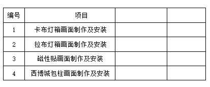 二、項目概況:本次大媒體廣告制作、安裝服務(wù)采購項目進行制作、安裝單位供應(yīng)商的招標(biāo),歡迎符合資格的單位參加投標(biāo)。采購范圍見下表: