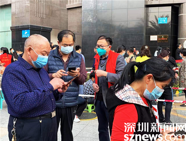 羅湖區(qū)審計(jì)局副局長(zhǎng)陳偉健在水貝社區(qū)防疫現(xiàn)場(chǎng)指導(dǎo)使用“i深圳”。