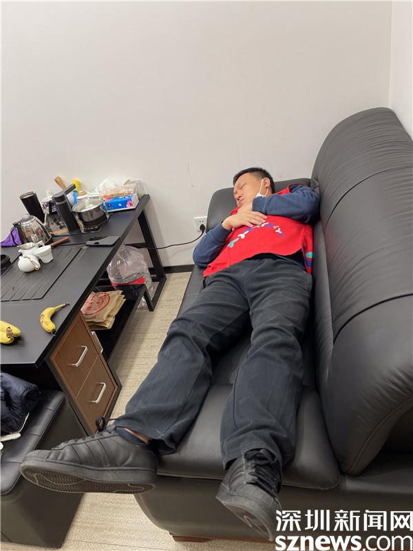 1月10日凌晨5點多,桂園街道桂木園社區(qū)黨委書記劉劍從核酸檢測點回來,躺在辦公室的沙發(fā)上,連身上的紅馬甲都沒有脫就睡著了。