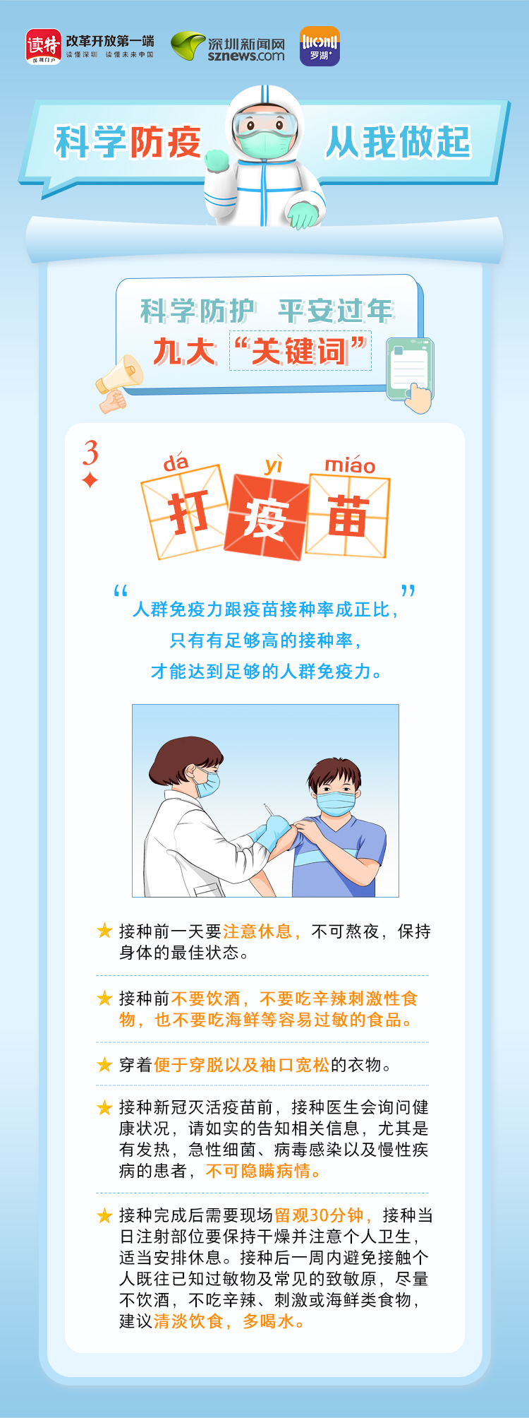 為更好地保護(hù)自己和他人的健康,度過一個(gè)祥和平安的春節(jié),請(qǐng)查收《科學(xué)防護(hù)平安過年九大“關(guān)鍵詞”》。在這場(chǎng)沒有硝煙的戰(zhàn)斗中,公安干警、醫(yī)護(hù)人員、社區(qū)工作者、志愿者始終堅(jiān)守在一線,齊心協(xié)力、眾志成城抗擊疫情。讓我們攜手并進(jìn),共同抗疫,采用科學(xué)有效的方式做好自身防護(hù),不僅對(duì)自己負(fù)責(zé),更是對(duì)家人負(fù)責(zé),對(duì)社會(huì)負(fù)責(zé)。