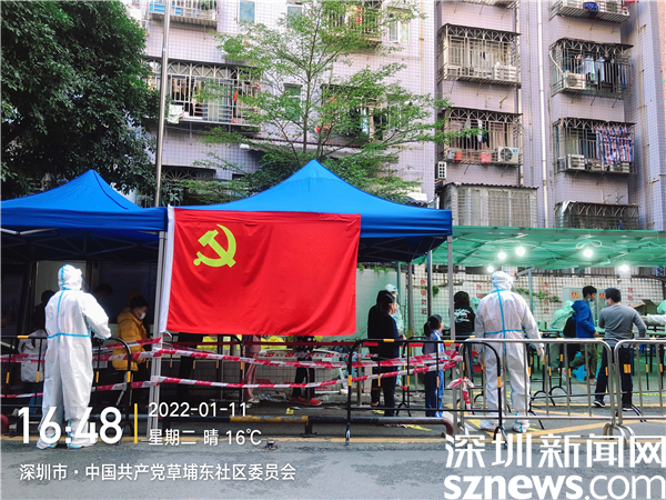 黨旗在羅湖區(qū)東曉街道草埔東社區(qū)嚇圍核酸檢測點高高飄揚(yáng)。