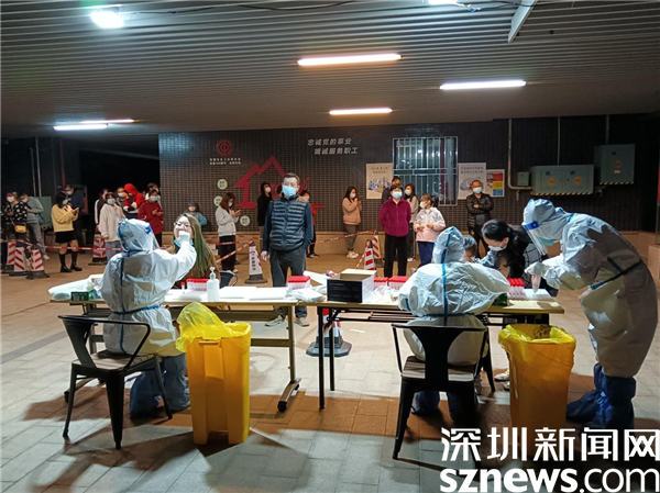 這天,老圍社區(qū)某棟樓全員檢測,社區(qū)緊急設(shè)立了臨時檢測點,社區(qū)黨委書記許少瓊忙前忙后指揮布置現(xiàn)場,調(diào)度管理處通知住戶下樓采樣,所有社區(qū)工作人員緊急行動起來,醫(yī)務(wù)人員也很快就位,居民積極配合,采樣工作有序進行。