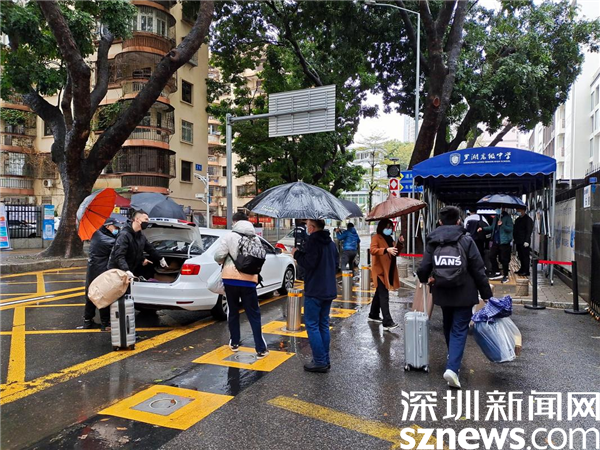 上午8:00左右,深圳市羅湖高級(jí)中學(xué)高三學(xué)子陸續(xù)返校。大雨雖然下個(gè)不停,但是學(xué)生們返校的心情卻絲毫沒(méi)有受到影響。在校門口,老師、學(xué)校物業(yè)工作人員為學(xué)生們撐傘、對(duì)行李進(jìn)行消毒、協(xié)助掃碼填報(bào)信息,有序幫助學(xué)生接過(guò)行李并用小推車運(yùn)送至宿舍樓?!斑@次開學(xué)和以往開學(xué)有所不同,我的感觸也很深。下著大雨,老師們忙前忙后為我們運(yùn)送行李,覺(jué)得非常感動(dòng)?!绷_湖高級(jí)中學(xué)高三學(xué)子張睿說(shuō)道。