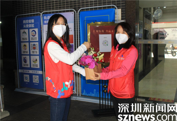 在老圍花園C2卡口,老圍社區(qū)黨委書記、婦聯(lián)主席許少瓊將花籃送到堅(jiān)守在這里的居民義工陳艷芳手中,感謝她對(duì)社區(qū)疫情防控的支持。一直以來(lái),陳艷芳只要有空就到社區(qū)做義工,核酸檢測(cè)點(diǎn)、小區(qū)卡口都是她的戰(zhàn)場(chǎng),查驗(yàn)綠碼、場(chǎng)所碼、督促戴口罩,測(cè)體溫,早已游刃有余,是名副其實(shí)的抗疫女戰(zhàn)士。她接過(guò)花籃,對(duì)許少瓊說(shuō),“其實(shí)社區(qū)工作人員更辛苦。”
