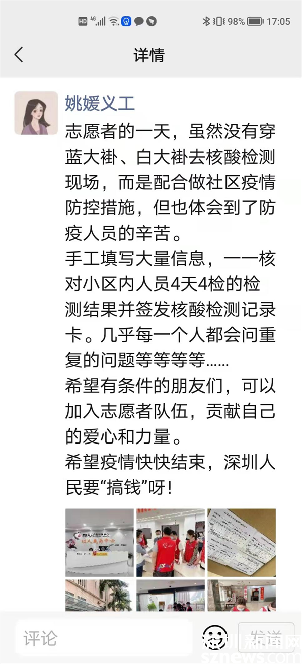 她在朋友圈呼吁:“希望有條件的朋友們,可以加入志愿者隊(duì)伍,貢獻(xiàn)自己的愛心和力量?!彼f,她所供職的優(yōu)合集團(tuán)已經(jīng)組織了122人的志愿隊(duì)伍,分布在全市各區(qū),奮力投身全市抗疫戰(zhàn)斗。雖然做志愿者很辛苦,但她不忘調(diào)侃:希望疫情快快結(jié)束,深圳人民要“搞錢”呀!
