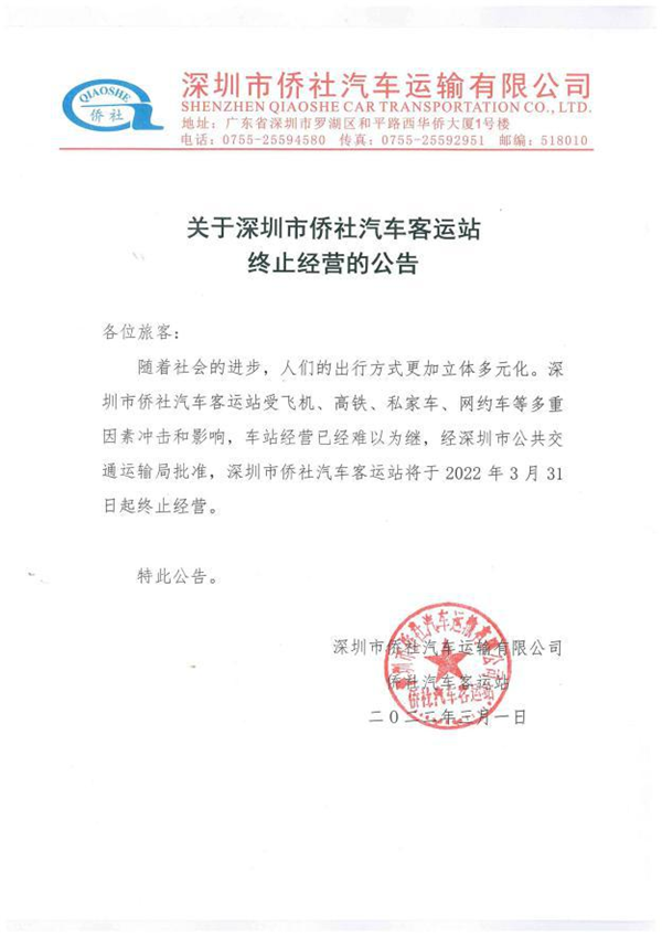 近年來,隨著國家經(jīng)濟社會的發(fā)展,人們的生活日新月異,大家的出行方式日趨呈現(xiàn)多元化,汽車客運站承載的長途客運服務(wù)功能逐漸被削弱。據(jù)深圳市交通運輸局羅湖管理局相關(guān)負責人介紹,近兩年來,在新冠肺炎疫情沖擊下,僑社客運站日均發(fā)送旅客寥寥無幾,客運站經(jīng)營難以為繼,無奈之下決定終止經(jīng)營。