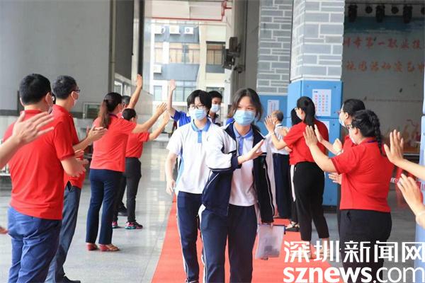 除了家長的花式祝福外,老師們的加油行動也是一道亮眼風(fēng)景線。羅湖翠園中學(xué)校長,高三年級主任身穿紅色送考服為考生加油。深圳市第一職業(yè)技術(shù)學(xué)校校領(lǐng)導(dǎo)和老師們在考生必經(jīng)考場的路上,站成兩列縱隊等待著考生,當考生經(jīng)過時,老師們伸出手與考生擊掌,為考生加油。