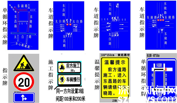 標(biāo)志標(biāo)線調(diào)整。東昌路等片區(qū)道路實(shí)施小范圍單循環(huán)后,涉及東昌路、太白路、東曉路、東湖路、昌曉一路等周邊道路標(biāo)志標(biāo)線重新調(diào)整,在施工上游路段設(shè)置施工提示牌,道路交叉口設(shè)置車道指示牌,提示過往車輛按照導(dǎo)行標(biāo)志標(biāo)線單向行駛。