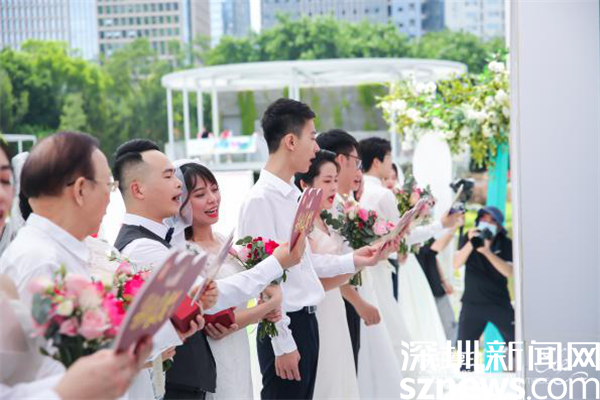 羅湖區(qū)委常委、宣傳部部長呂漫妮,羅湖區(qū)民政局局長楊文秀,羅湖區(qū)民政局副局長藍(lán)茜,2021年深圳市“最美家庭”的獲得者李道倫和王蓬勃夫婦,羅湖公益“紅娘”汪朝暉作為特邀頒證師,分別給9對新人頒證。