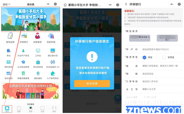 學(xué)生及家長可通過“深分類”小程序首頁主題活動(dòng)入口進(jìn)入活動(dòng)。在參與活動(dòng)之前,學(xué)生所在學(xué)校需開通環(huán)保銀行支行,學(xué)生需注冊(cè)所在學(xué)校支行的環(huán)保銀行賬戶,并在活動(dòng)中進(jìn)行賬戶信息綁定、上傳參與學(xué)生照片才可參與后續(xù)打卡集贊活動(dòng)。