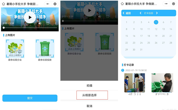 需要注意的是,學(xué)生在上傳照片時(shí),須上傳每日廚余分類和廚余投放照片,不可重復(fù)使用同一張照片進(jìn)行打卡,當(dāng)日多次上傳照片僅記錄打卡簽到1次;此外,如上傳與廚余垃圾分類無關(guān)的照片,系統(tǒng)將自動(dòng)作廢當(dāng)次打卡,判定該次打卡無效。