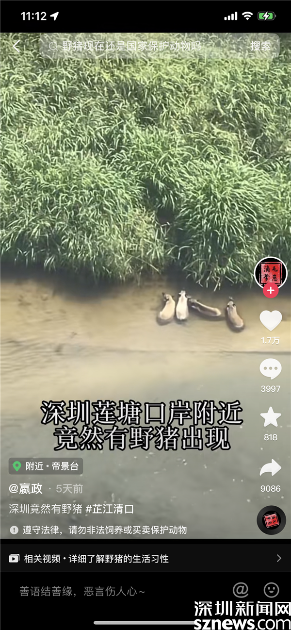 記者咨詢蓮塘街道和羅湖區(qū)城市管理綜合行政執(zhí)法局相關(guān)負(fù)責(zé)人表示,此次野豬出沒的地點(diǎn)的是在口岸對面,不屬于深圳管轄的范圍。此前,在仙湖植物園和梧桐山風(fēng)景區(qū)也頻現(xiàn)野豬身影。