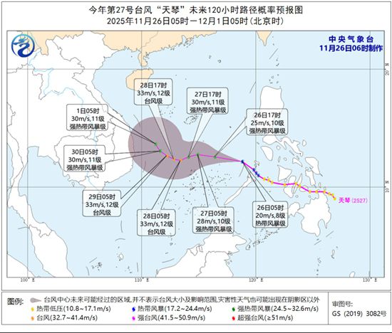 此外,海上還需關(guān)注今年第27號(hào)臺(tái)風(fēng)“天琴”。它已于今天凌晨移入南海,預(yù)計(jì),“天琴”將以每小時(shí)20至25公里的速度向偏西方向移動(dòng),強(qiáng)度逐漸加強(qiáng),最強(qiáng)可達(dá)臺(tái)風(fēng)級(jí),29日開始逐漸轉(zhuǎn)向西偏北方向移動(dòng),向南海中西部海面靠近,強(qiáng)度緩慢減弱。