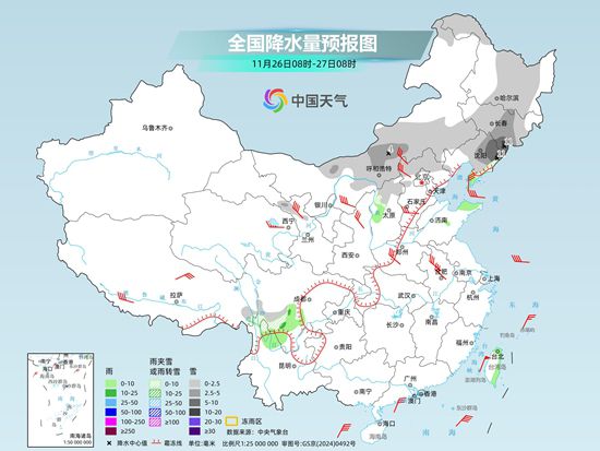 具體來看,中央氣象臺(tái)預(yù)計(jì),今天內(nèi)蒙古中西部和東南部、山西北部、河北北部、東北地區(qū)大部等地部分地區(qū)有小雪或雨夾雪,其中,內(nèi)蒙古中部和西北部、吉林中南部、遼寧中東部等地部分地區(qū)有中到大雪,局地暴雪。遼東半島、山西中部、山東半島、四川南部、云南西北部、臺(tái)灣島東部等地部分地區(qū)有小雨,局地有中雨。