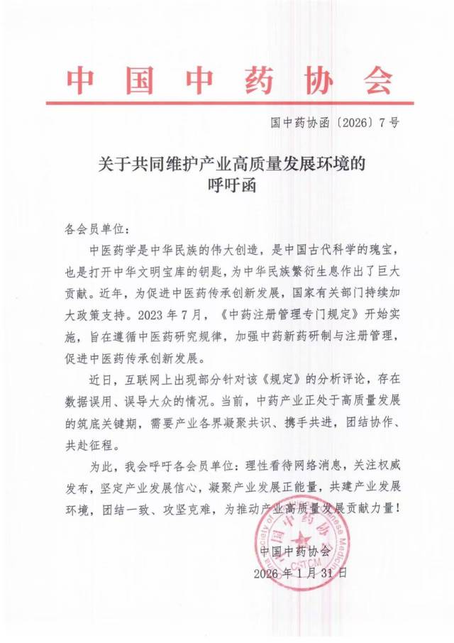中國中藥協(xié)會發(fā)布的《關(guān)于共同維護產(chǎn)業(yè)高質(zhì)量發(fā)展環(huán)境的呼吁函》指出,《中藥注冊管理專門規(guī)定》實施旨在遵循中醫(yī)藥研究規(guī)律,加強中藥新藥研制與注冊管理,促進中醫(yī)藥傳承創(chuàng)新發(fā)展。文章呼吁,當前,中藥產(chǎn)業(yè)正處于高質(zhì)量發(fā)展的筑底關(guān)鍵期,需要產(chǎn)業(yè)各界凝聚共識、攜手共進,團結(jié)協(xié)作、共赴征程。