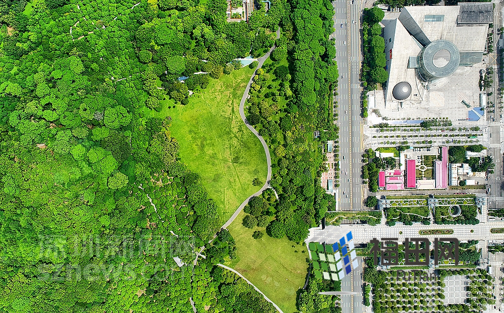 俯視近處的福田中心區(qū)。正南方的市民中心橫臥在前,猶如一只振翅欲飛的大鵬鳥。