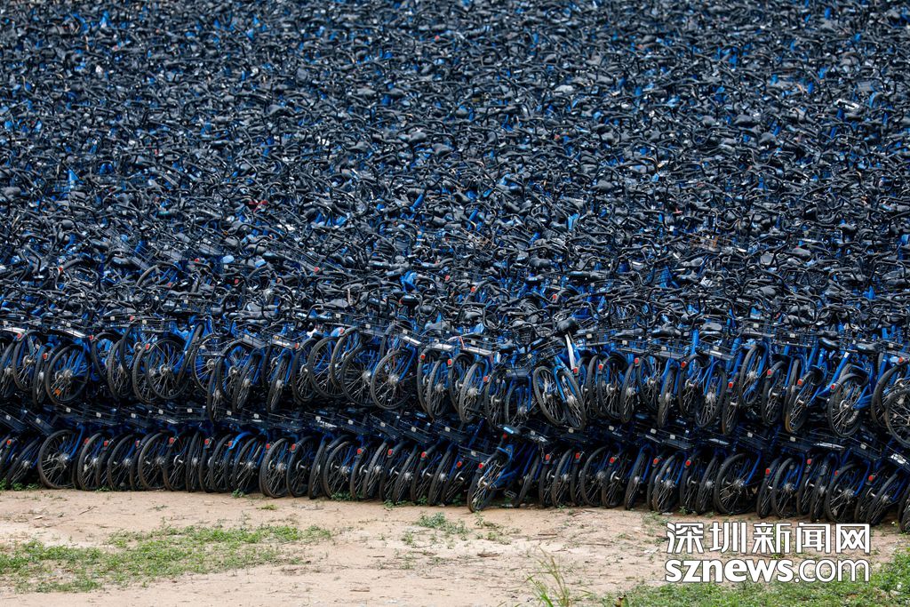 大量的小藍單車堆放在龍崗區(qū)水官高速旁的空地