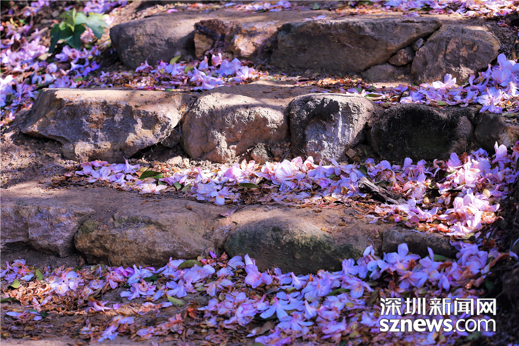 賞花石階上掉落的花瓣,陽光穿過綠葉照射在臺階上