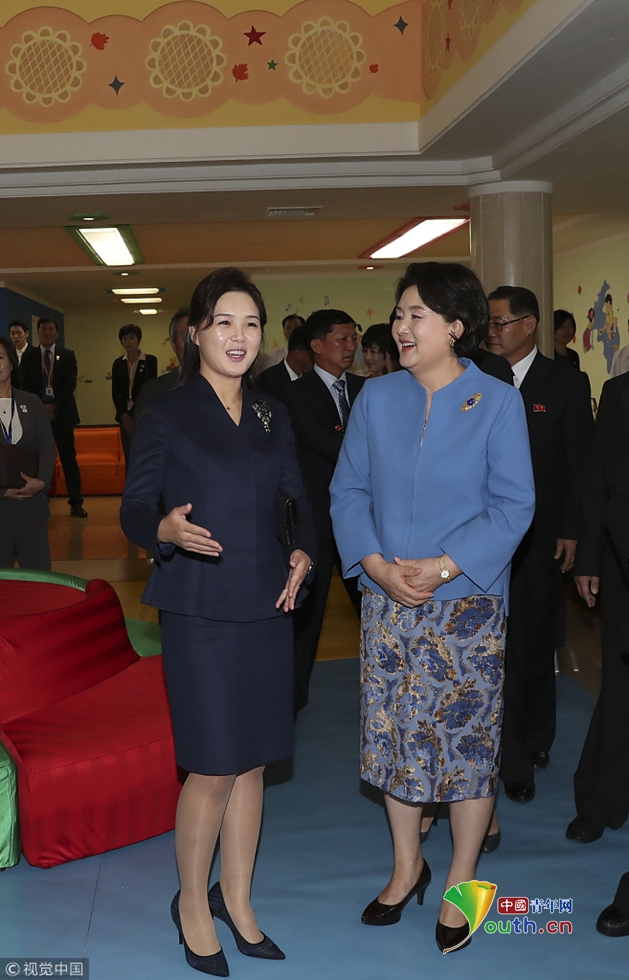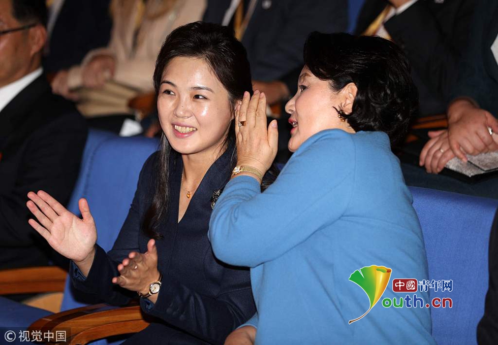 當(dāng)?shù)貢r間2018年9月18日,朝鮮平壤,韓國總統(tǒng)文在寅夫人金正淑在朝鮮國務(wù)委員會委員長金正恩夫人李雪主的陪同下參觀平壤金元均音樂大學(xué)。圖片作者:視覺中國