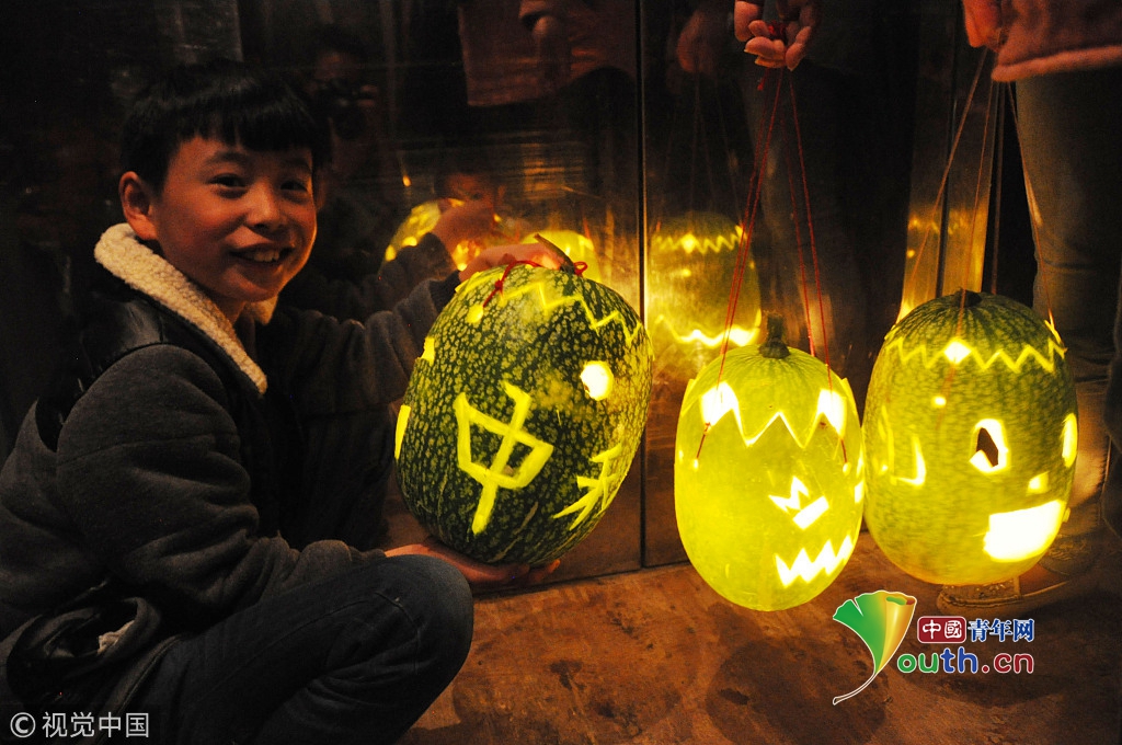 2015年9月27日,貴州省威寧縣海邊街道大洼塘社區(qū),一名孩子在展示手工制作的瓜燈。當日,是中國傳統(tǒng)節(jié)日“中秋節(jié)”,群眾與孩子們一道制作手工瓜燈,歡度中秋佳節(jié)的到來,當?shù)赜兄谱鞴蠠魬c中秋的習俗。